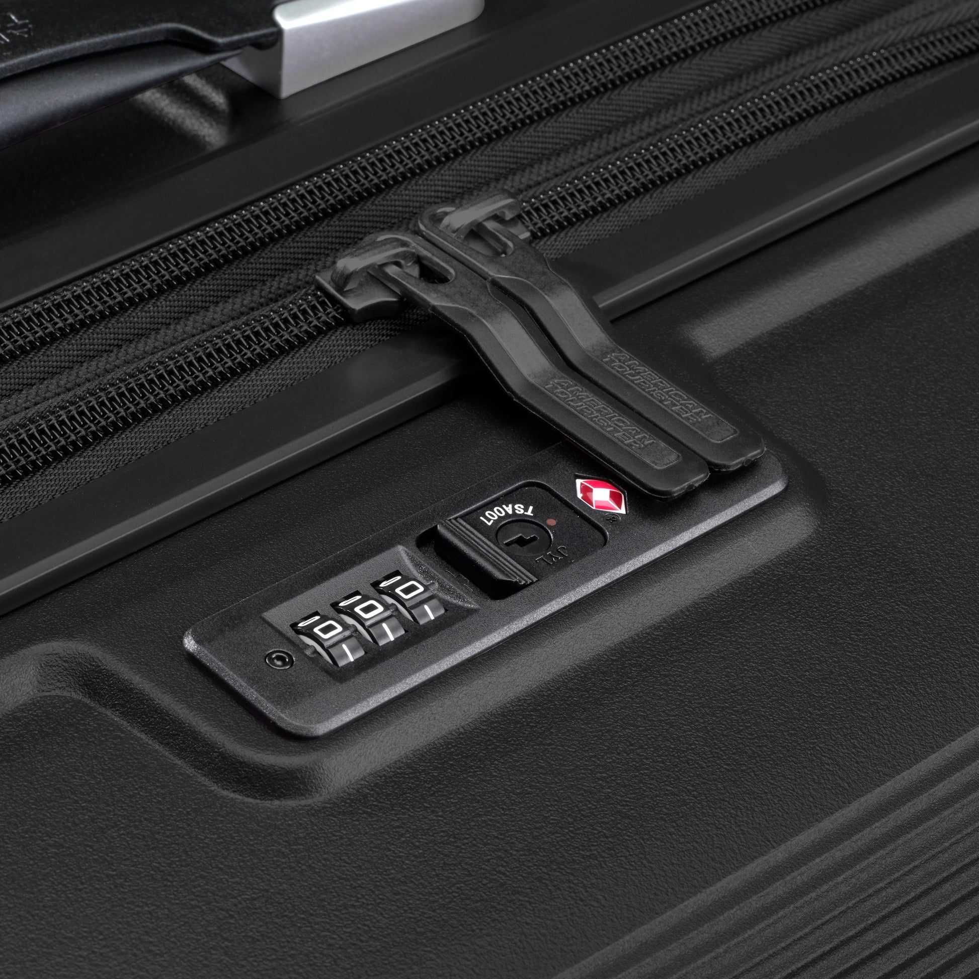 • Tirettes de fermeture éclair co-moulées signées American Tourister