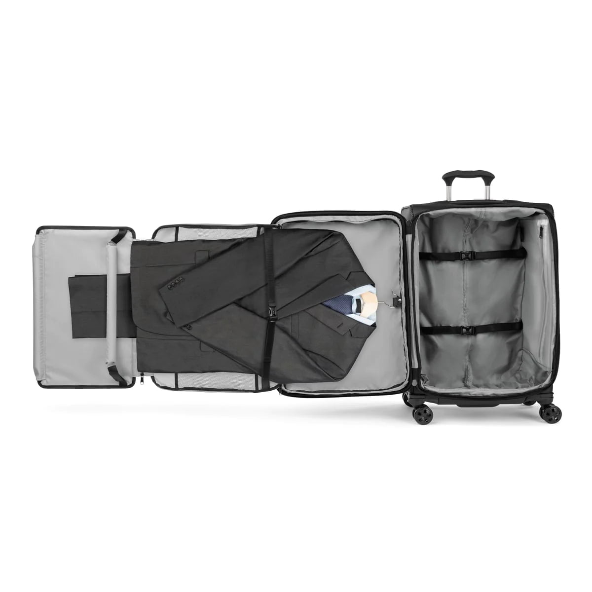 Arrivez sans pli grâce au fold-out suiter amovible, conçu pour protéger les vêtements suspendus contre les rides. Des sangles de maintien intérieures, un espace de rangement résistant à l'eau et plusieurs poches pour accessoires ajoutent à l'organisation, gardant tout à sa place et facile à trouver.