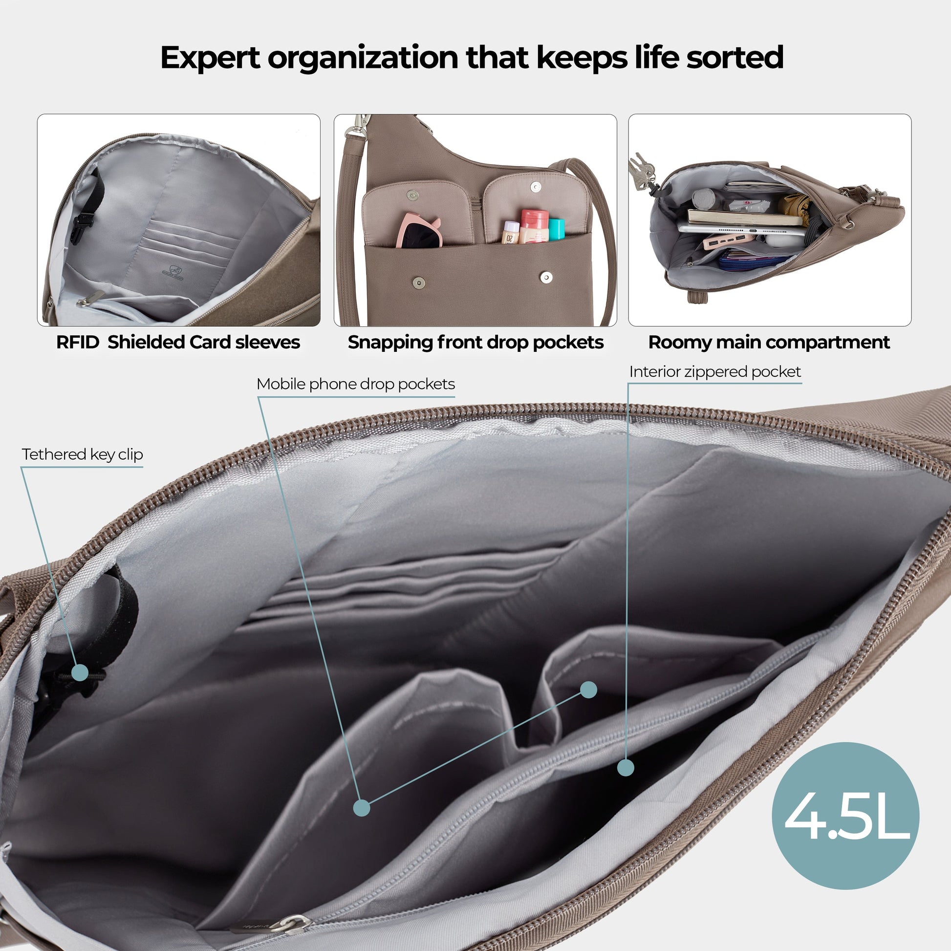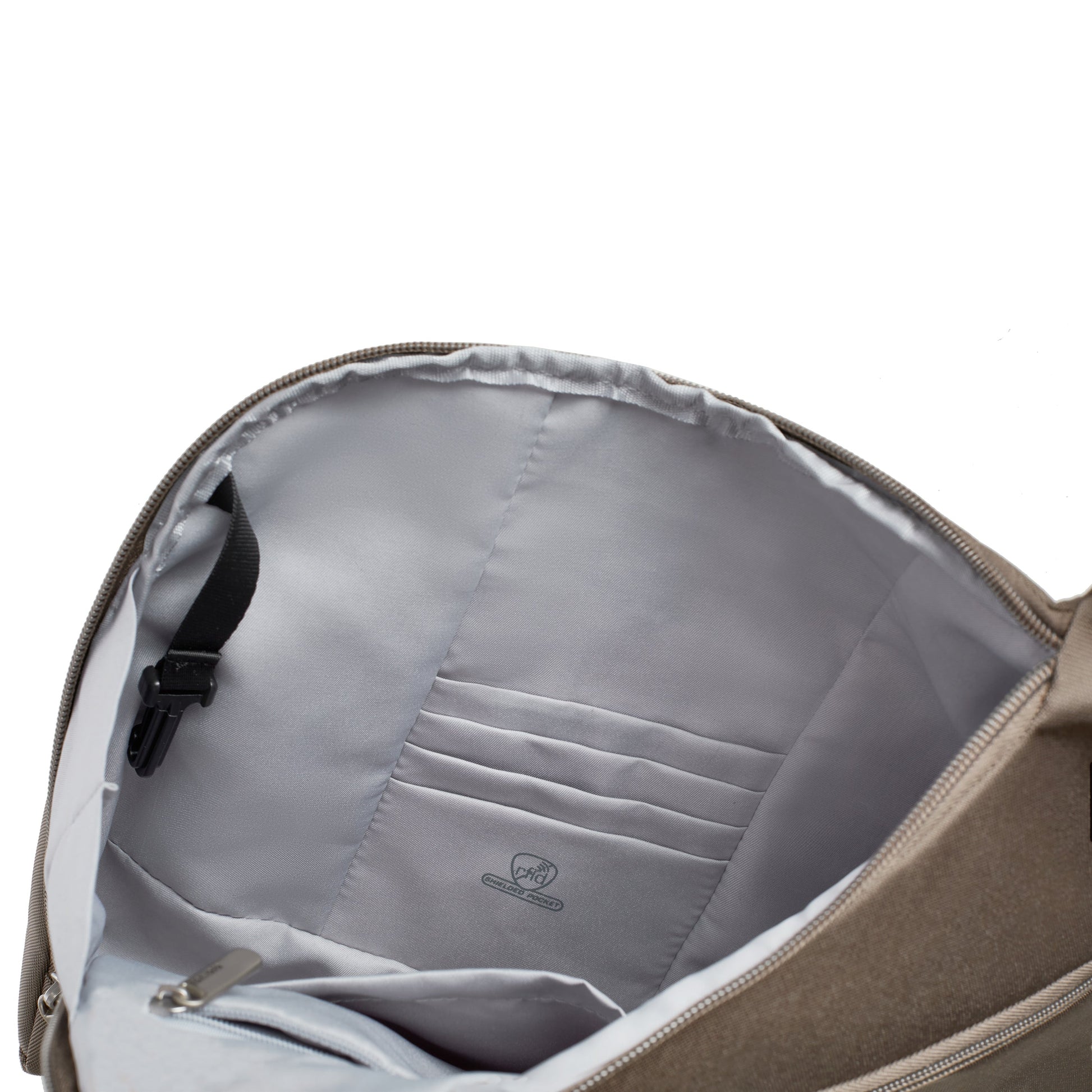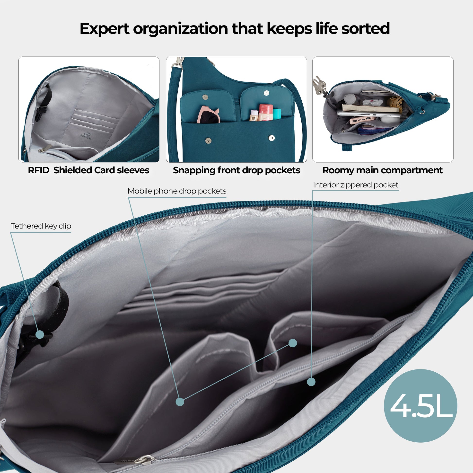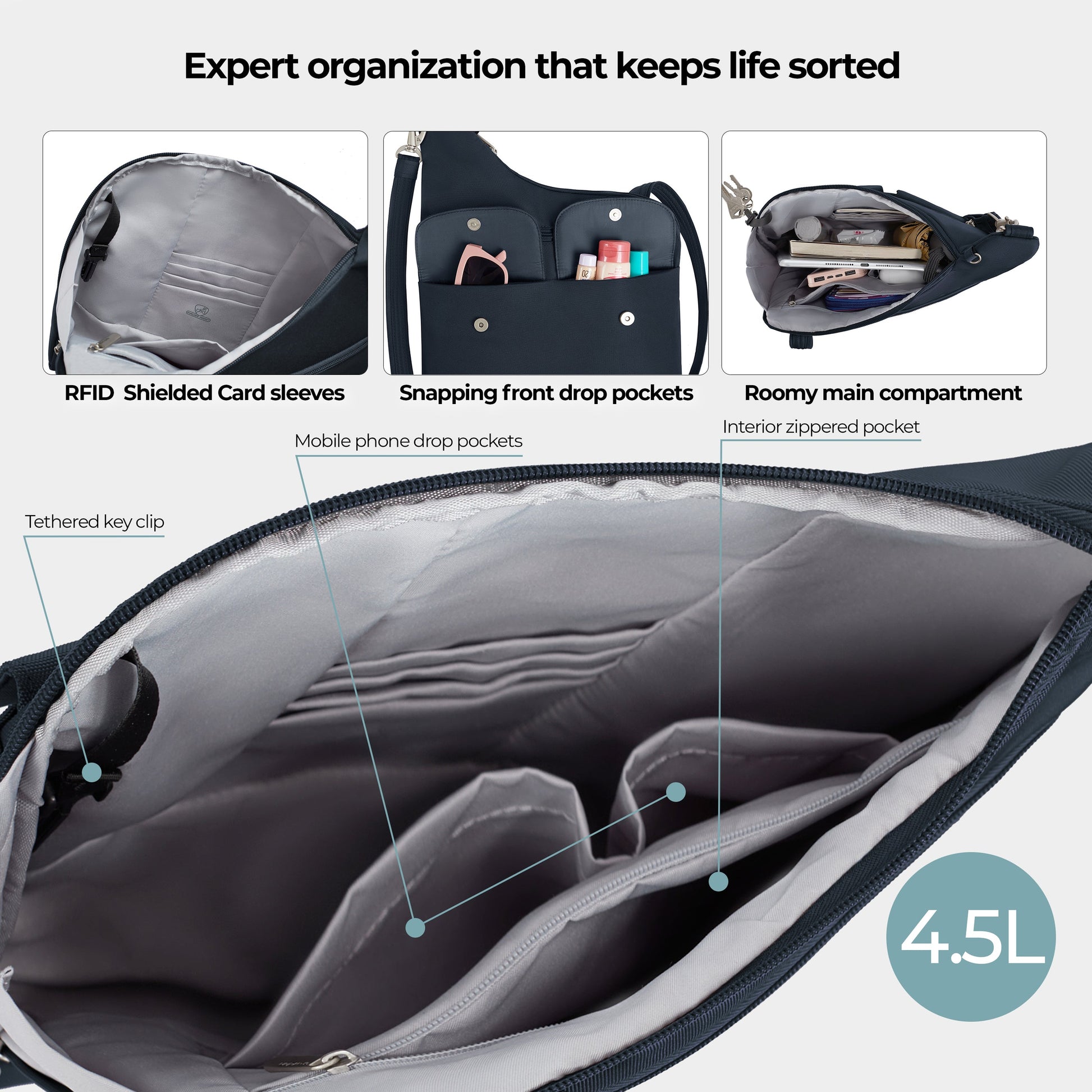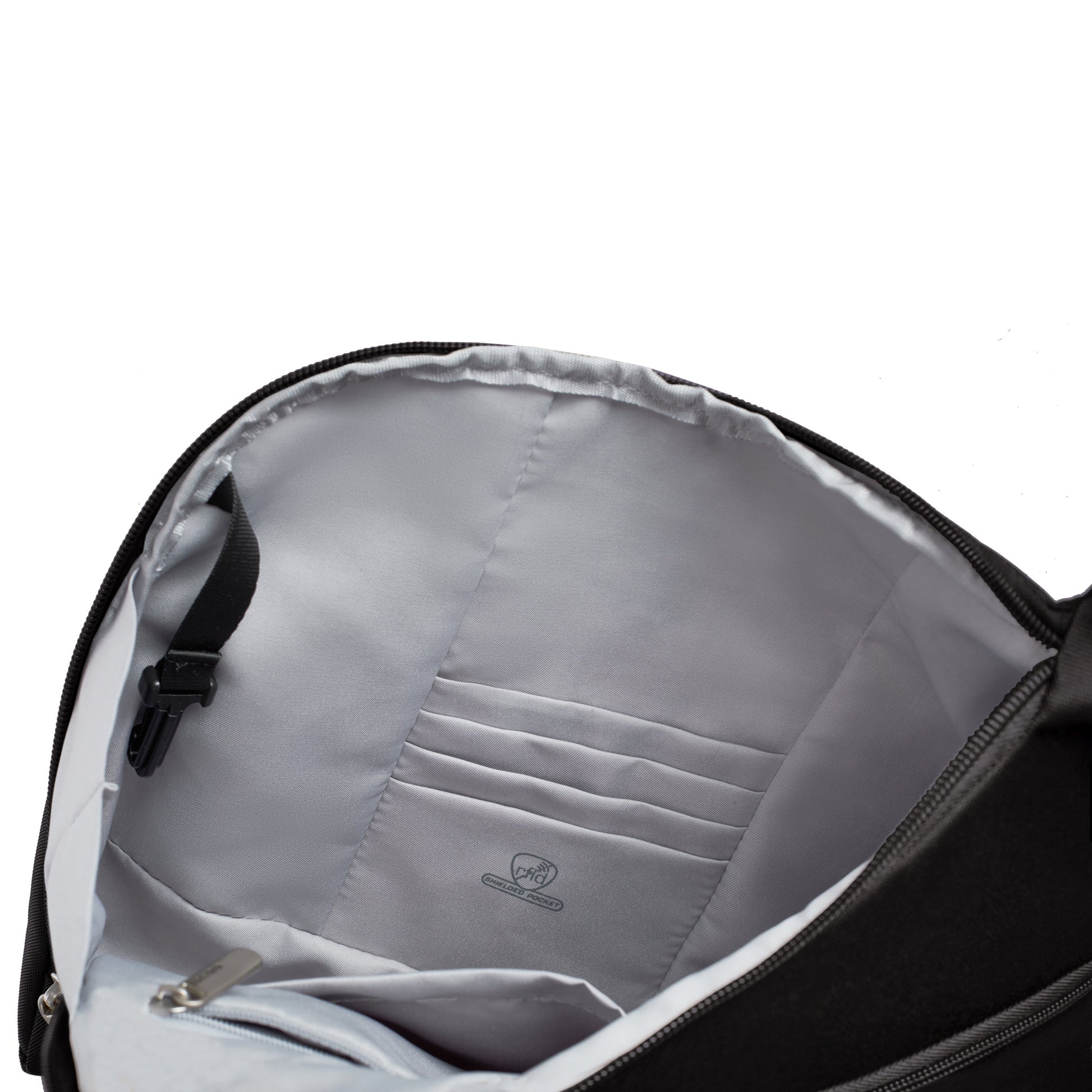 - Main compartment with interior organization panel with slip pocket and zippered pocket