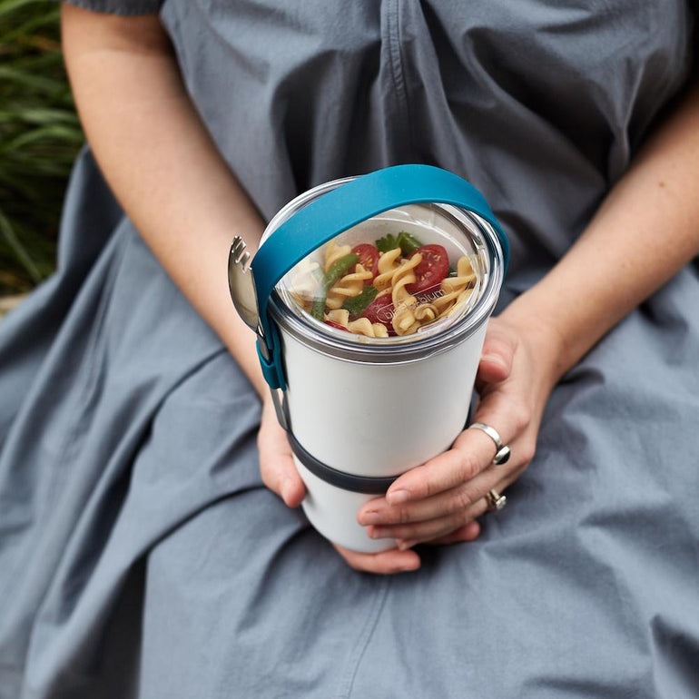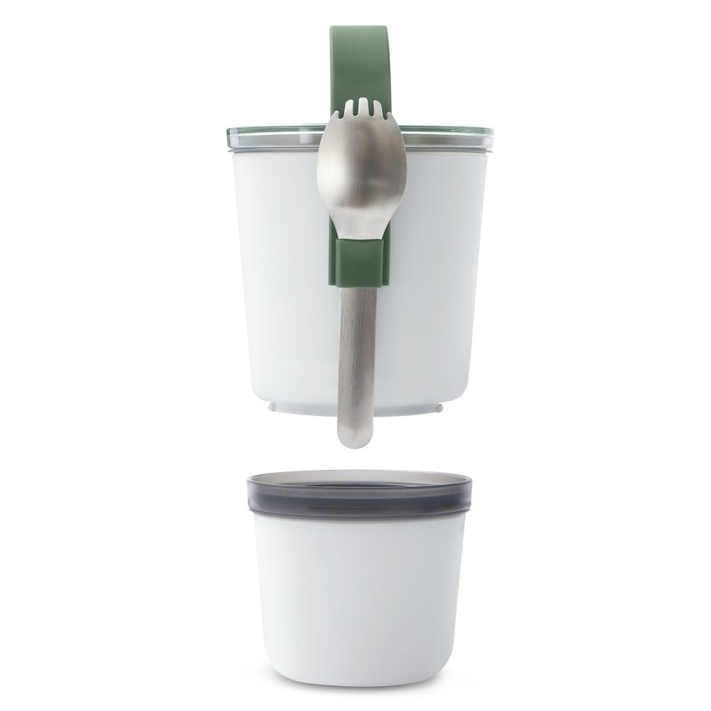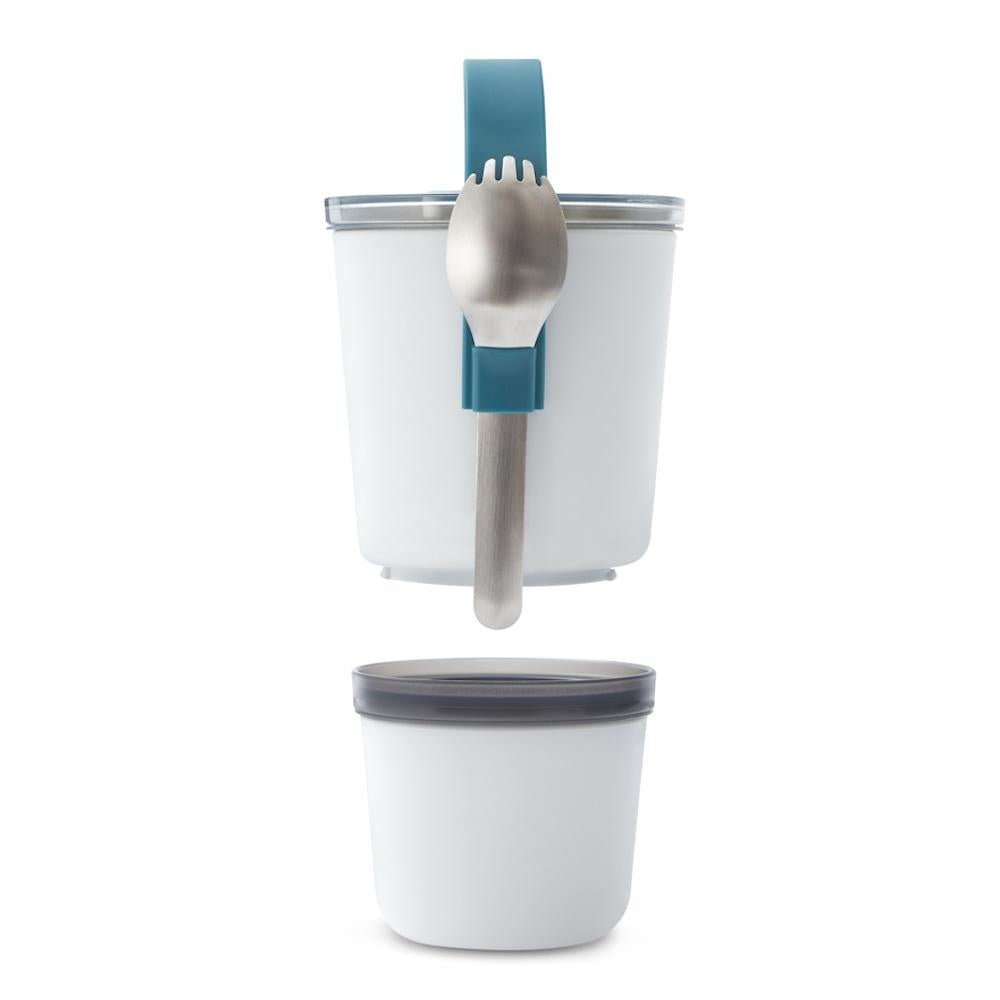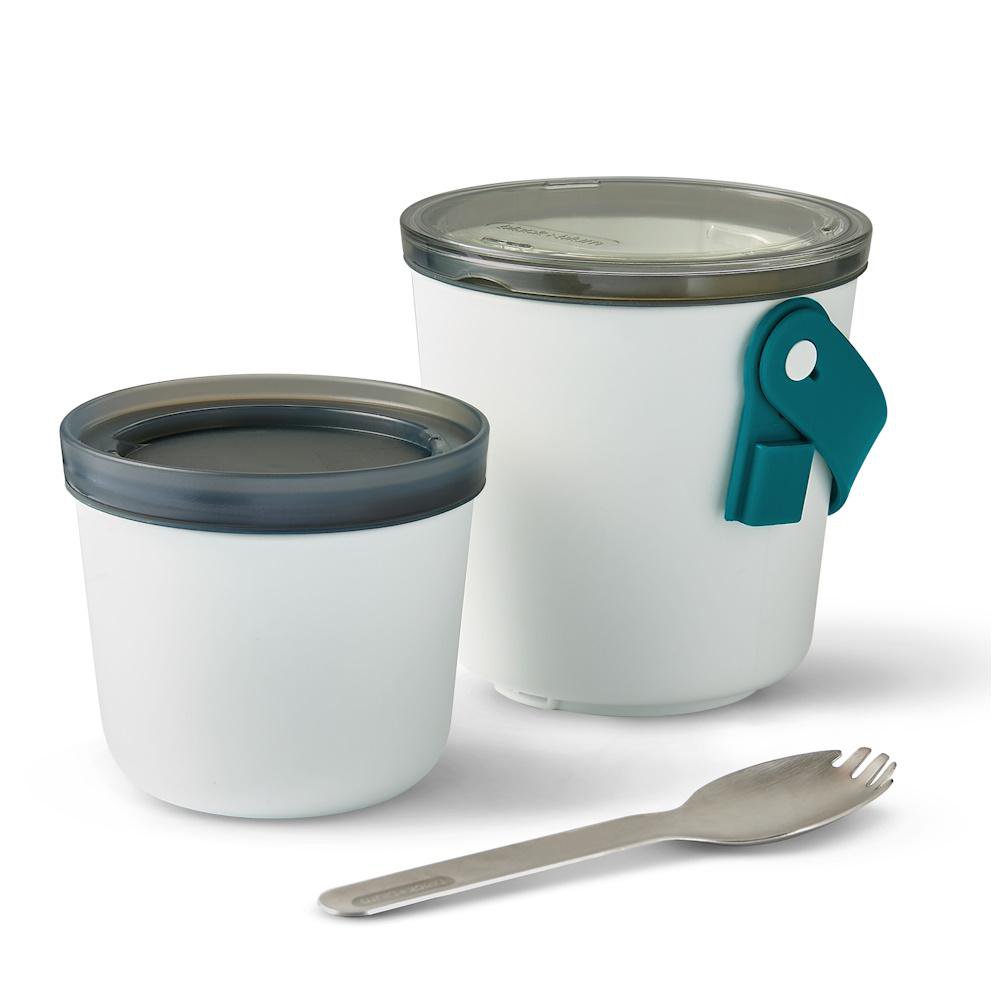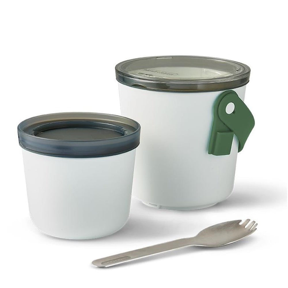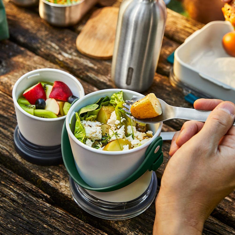 Inspired by Indian tiffin carriers, the Lunch Pot is slimmer and taller which makes it compact and easy to put in your bag. The Lunch Pot Original consists of two water-tight pots that can be locked together for carrying. The pots have a convenient silicone carrying strap which also holds the stainless steel “spork” (spoon and fork). Separate anything from yoghurt and fruit to noodles and soup. When you’re finished, the smaller pot fits inside the larger pot for easy storage.