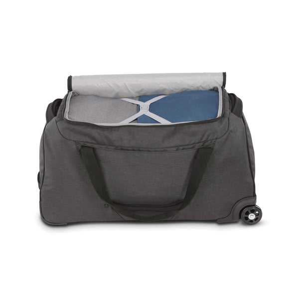 - Wheeled duffles offer roomy single compartment design with large U-shaped opening for easy access, grab and go handles on all sides, quick access stash pockets on the front and side, and interior cross-straps.