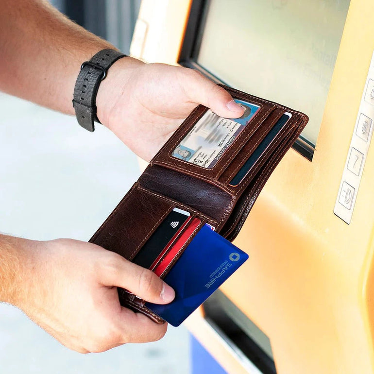 Organize your cash, cards, and photo ID in this classic leather bifold RFID wallet. The Voyager Bill fold is made from hand-stained buffalo leather that builds a rich patina as it ages. It features rounded corners to resist breakage, five card slots, double currency pockets, slip pockets for important papers and receipts, and a window slot for your driver's license, school, or work ID. Classic styling combined with resilient leather ensure that this hand made wallet will look better the longer that you carry it.