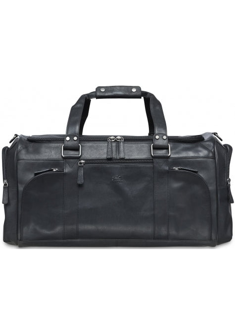 This luxurious and versatile duffle bag features a large main compartment and multiple zippered and slit pockets. The rear is equipped with an add-a-bag strap to piggy-back the duffel on other baggage.