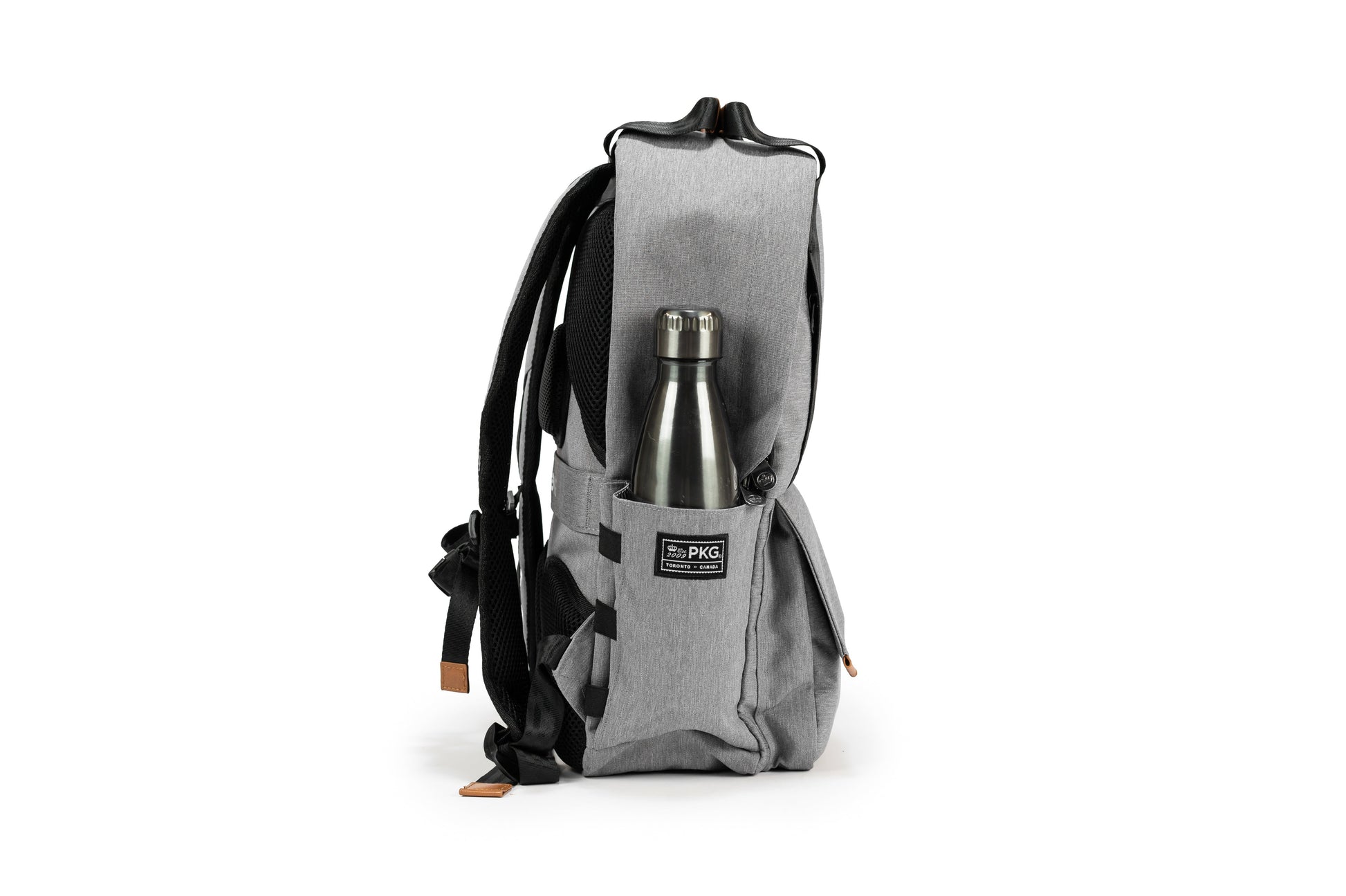 - Two expandable side water bottle pockets