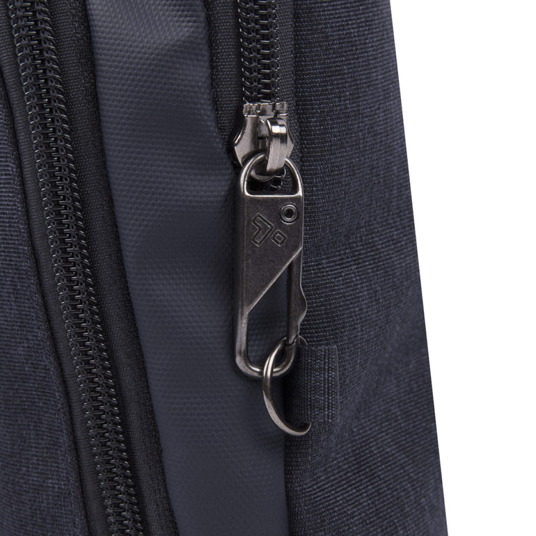 - Full Anti-Theft features include surround slash-resistant body panels and shoulder strap; locking compartments; lockdown strap; and RFID blocking card and passport slots and pockets